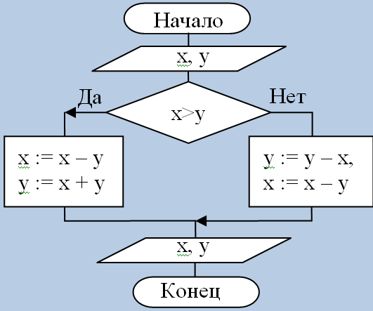 7) Исполните алгоритм при х= 10 и у= 15. Какие значения будут получены в результате его работы?