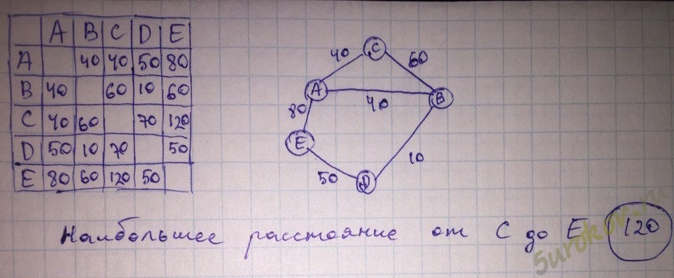 Задание 173. На схеме нарисованы дороги между населенными пунктами А, В, С, D, Е и указаны их протяженности. Определите, какие два населенных пункта наиболее удалены друг от друга (при условии, что передвигаться можно только по указанным на схеме дорогам). В ответе укажите кратчайшее расстояние между этими населенными пунктами (номер верного варианта).