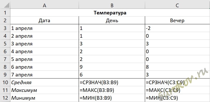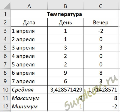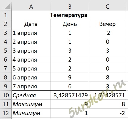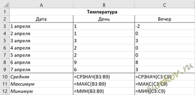 Запишите в ячейки В10:С12 формулы для вычисления средней, максимальной и минимальной температур днем и вечером в первой семидневке апреля.