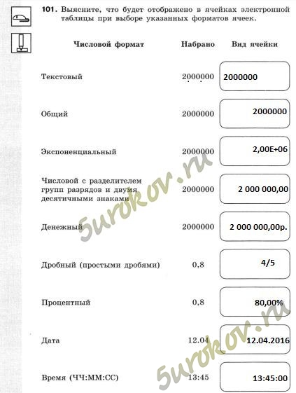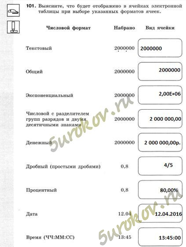 Задание 101. Выясните, что будет отображено в ячейках электронной таблицы при выборе указанных форматов ячеек.