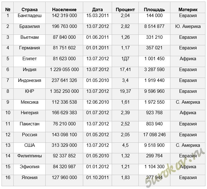 Ответ: 1 - Какую строку будет занимать запись, содержащая данные о России, после сортировки по убиванию значение поля "Население"?