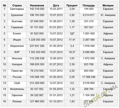 Количество: 2 Номера: 8, 12 - ((Население > 80 000 000 И Дата>01.01.2012) ИЛИ Площадь < 500 000)