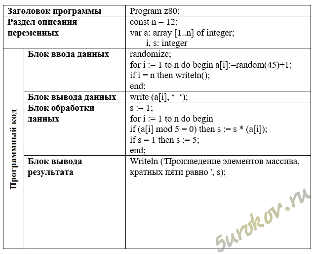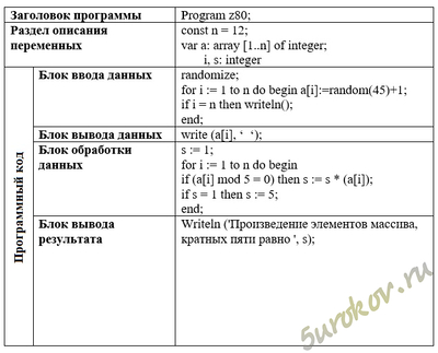 Writeln ('Произведение элементов массива, кратных пяти равно ', s);