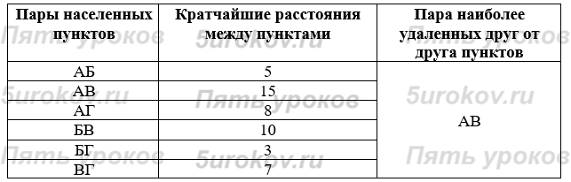 Передвигаться можно только по указанным на схеме дорогам. Определите кратчайшее расстояние между наиболее удаленными друг от друга пунктами. Для решения задачи заполните таблицу.