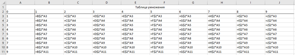 Составьте таблицу умножения чисел первого десятка. Используйте смешанные ссылки.