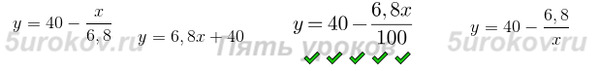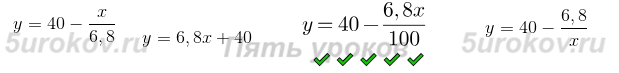 5) Количество бензина в баке автомобиля, вместимость которого 40 л, уменьшается на 6,8 л за 100 км пути. Количество бензина V, остающегося в баке, является функцией от расстояния x(в км), пройденного автомобилем. Выберите формулу, являющуюся математической моделью описываемого процесса.