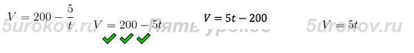 6) Из полного бака, вместимость которого 200 л, через открытый кран вытекает вода со скоростью 5 л в минуту. Количество воды V, остающейся в баке, является функцией от времени t (в минутах), в течение которого вытекает вода. Выберите формулу, являющуюся математической моделью описываемого процесса.